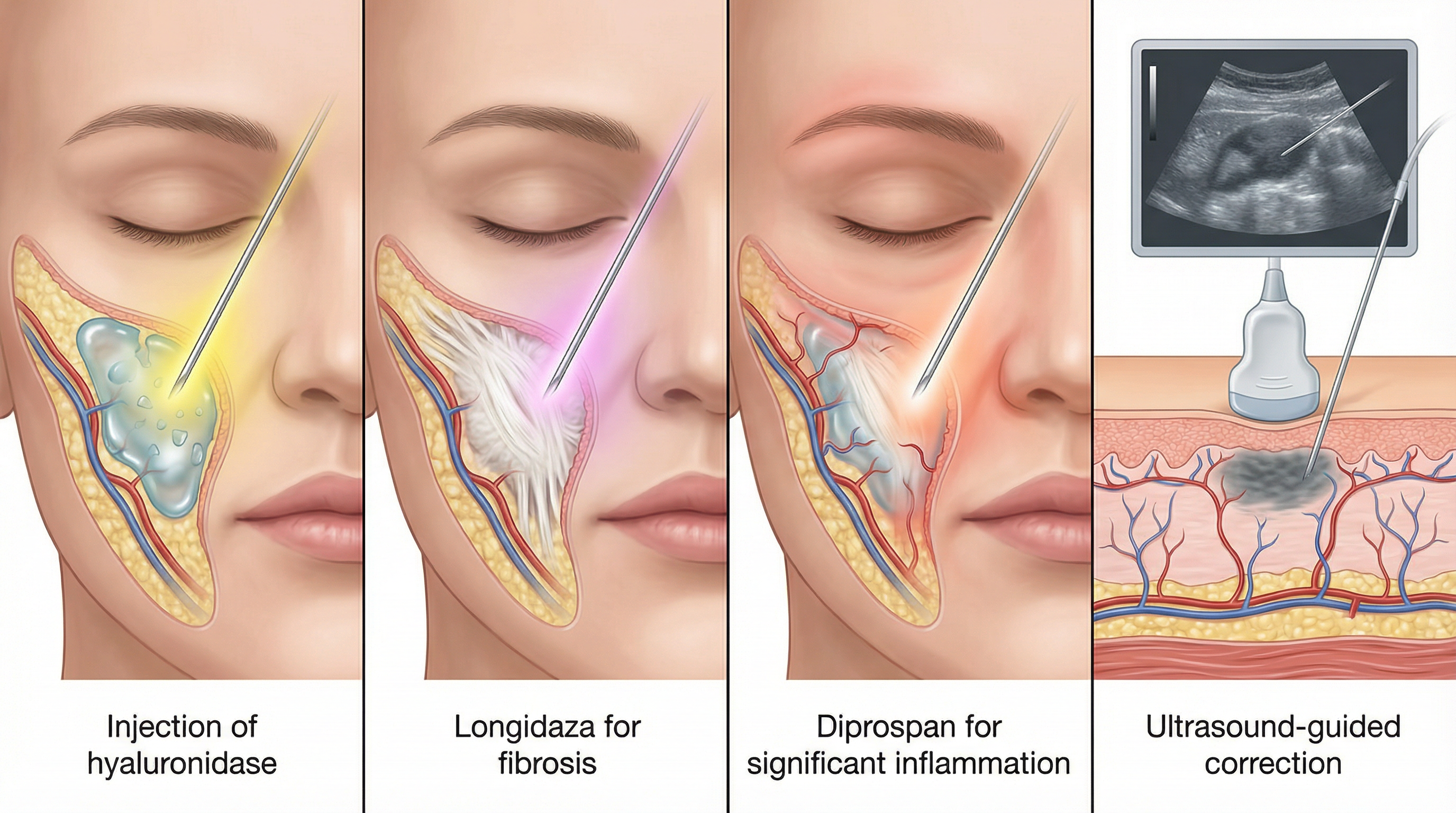 Ультразвуковая диагностика (УЗИ) стала золотым стандартом в диагностике осложнений после филлеров. Она позволяет в режиме реального времени визуализировать расположение и глубину залегания геля, определить наличие или отсутствие фиброзной капсулы, выявить сосудистые структуры в зоне осложнения, оценить объём остаточного геля. Применение УЗИ-навигации при введении корректирующих препаратов повышает точность процедуры, снижает необходимые дозы препаратов и позволяет добиться ответа там, где слепой пальпацией эффекта достичь сложнее.