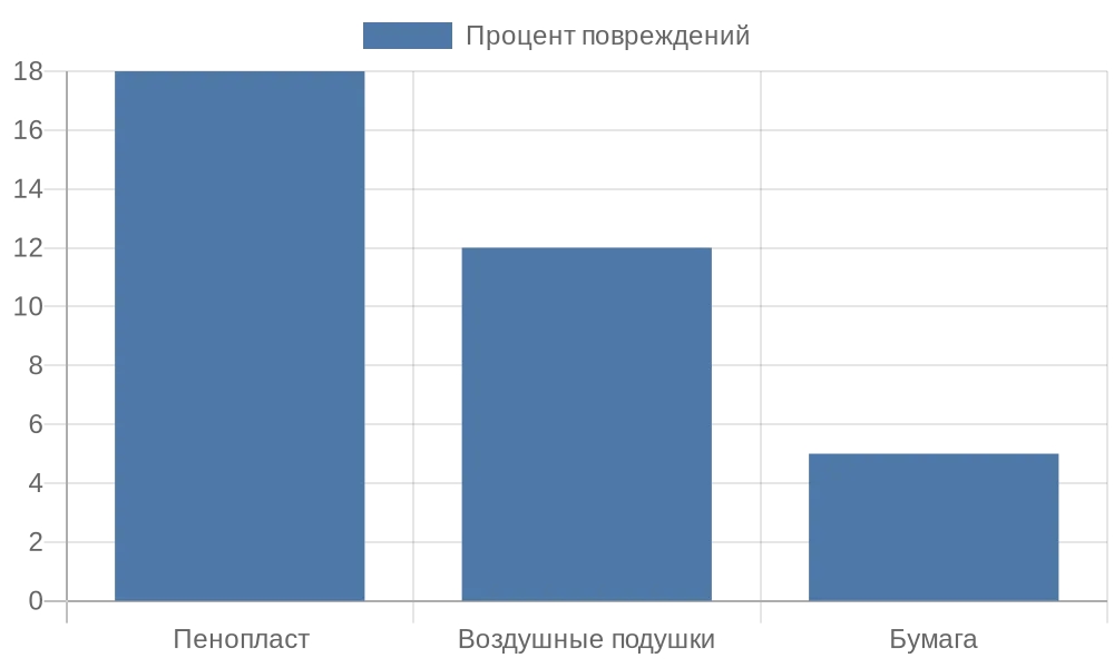 Чтобы визуализировать распределение рисков при разных методах упаковки, рассмотрим диаграмму на основе агрегированных данных из отчетов российских логистических компаний. Она показывает процент повреждений по типам материалов за период 2024–2025 годов, с гипотезой о сохранении тенденций: бумага демонстрирует наименьшие потери благодаря своей структуре.